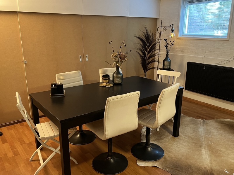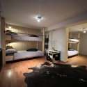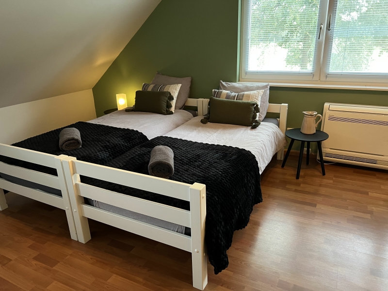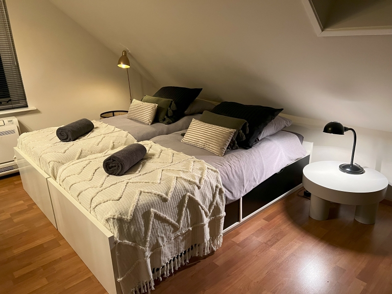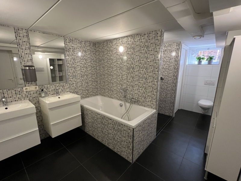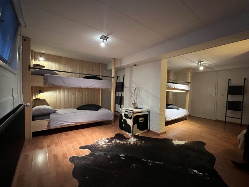 Beneden hebben we een ruim souterrain met een grote slaapkamer met 2 stapelbedden en een grote woonkamer met comfortabele zithoek en een eettafel. Ook vind je er een luxe badkamer met toilet, 2 douches, 2 wastafels en een bad. Gebruik maken van onze sauna is ook mogelijk tegen een meerprijs.